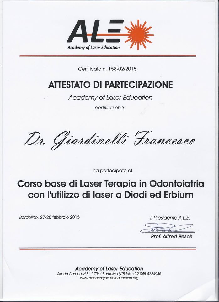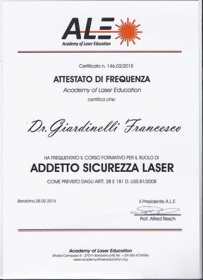 Per offrire ai propri pazienti un servizio a 360 gradi e mettere in relazione l'armonia del sorriso con quella del viso, si è perfezionato frequentando il Corso Formativo di Laser Terapia in Odontoiatria con l’utilizzo di Laser Adiodi ed Erbium presso la sede A.L.E. (Accademy of Laser Education) di Bardolino, ed il Corso Formativo per il ruolo di Addetto Sicurezza Laser presso la stessa sede A.L.E. di Bardolino.